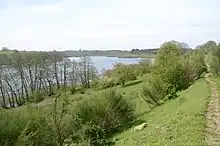 Udsigt mod vest fra stien øverst på skrænten på søens nordside