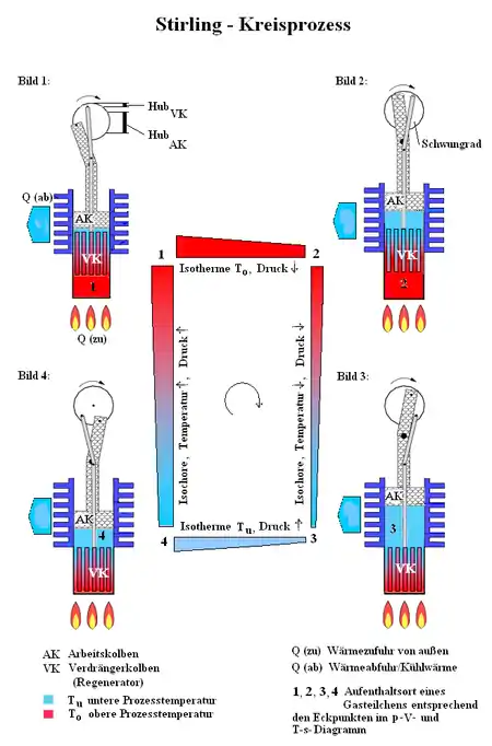 Stirlingmotorens termodynamiske kredsproces består af 4 termodynamisk processer, som beskrives sammen med tegninger fra arbejdsfasernes yderpunkter. [11] Det antages at trykket på ydersiden af arbejdsstemplet er en middelværdi af trykket indeni cylinderen.