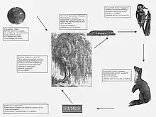 - Eksempel: Egeblade (planter) ædes af oldenborrer (planteædere), som ædes af råger (rovdyr af 1. orden), som ædes af mårer (rovdyr af 2. orden). Undervejs taber alle deltagerne forskelligt affald: blade, bark, rodspidser, huder, fjer og afføring, og før eller siden dør de.