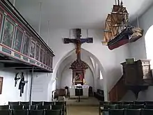 Granit-døbefonten er fra 1200-tallet og viser reliefer fra Paulus, Petrus og evangelistsymbolerne. Drager på døbefontens fod knyttes til den old-nordiske stil. Prædikestolen er i renæssancestil fra 1614. Altertavlen fra omkring 1700 i akantusbarok. Alterbilledet er fra 1920 og illustrerer Lazarus' opstandelse. Pulpituret er smykket med relieffer fra Jesu Liv. Triumfkorset over koret er fra 1400-tallet og dermed fra før-reformatorisk tid. Korset fremstiller Kristus som sejrende over døden. Kirkeskibet Urania blev 1719 skænket af søfarendes familie Detleffsen. Originalen er nu på Søfartsmuseet i Flensborg. Orglet er fra 1848. Et ældre orgel var skænket 1810 af gårdmand Jacob Henningsen i Kollerup. Kirken råder over hverken tårn eller klokke. Ved den vestre gavl står i stedet en klokkestabel med spir og vejrhane.