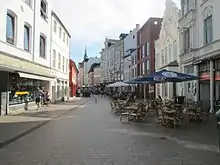 Storegade i Flensborg med Helligåndskirkens tårn i baggrunden