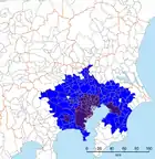| Tokyos pendlerbælte (東京大都市雇用圏 Koyō-ken) | Alle kommuner hvor minimum 10 % af befolkningen pendler til en af de 23 bydistrikterne. | 35,3 millioner | 10.403,76 | 3.348,2 | Center for Spatial Information Service på University of Tokyo | 2015 | ![]()  |