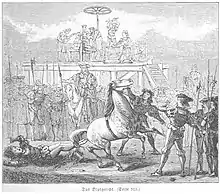 Straf i middelalderen kunne antage former, der i dag anses som barbariske. Illustrationen viser en offentlig afstraffelse den 9. februar 1310 i Wien, hvor den lokale hertug lod henrette nogle fanger, der havde deltaget i et oprør. En borger, Johann Sadelhauer, blev bundet til en hest og trukket gennem byen gader, for herefter af blive endeligt henrettet ved radbrækning. Andre borgere blev straffet ved at få  afhugget lemmer eller ved at få øjnene stukket ud.