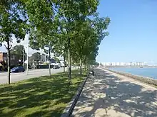 På den modsatte side er der en promenade på ca. 10 meters bredde ved Svanemøllestranden.