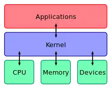 - Kernen (på engelsk kernel) er den centrale del af et styresystem. Dens opgave er at kontrollere ressourcer som hukommelse (ram) og tilgang til datalagerplads og eksterne enheder samt at fordele CPU-ressourcer til de forskellige applikationsprogrammer.