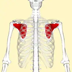 ![]() Subscapularis (i rødt). Ribbenene vises semi-transparent. | |