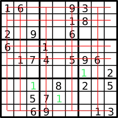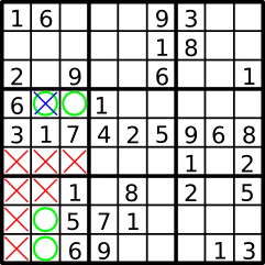 Kan et tal i en blok kun placeres i en bestemt række eller kolonne, om end tallet ikke endeligt kan placeres, kan viden herom anvendes til eliminering af tallets placering i de andre blokke, som rækken eller kolonnen indgår i. I eksemplet til højre er de mulige placeringer af tallet 2 markeret med grønne cirkler i to blokke. I nederste venstre blok kan tallet kun placeres i midterste kolonne, hvilket udelukker placering i denne kolonne i blokken ovenover (markeret med blåt kryds). I denne blok er placering af tallet 2 hermed henvist til cellen i blokkens øverste højre hjørne.
