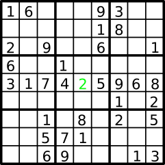 En metode er at se på hvilke tal der mangler for at skabe en komplet samling af tallene fra 1 til 9. I eksemplet til venstre mangler der kun et tal i den midterste række. Da tallet 2 mangler, placeres det i det ledige felt. En placering ved hjælp af denne teknik kan ofte føre til en situation, hvor en fornyet anvendelse af eliminering kan benyttes. Dette er dog ikke tilfældet her.