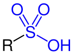 Generel struktur af sulfonsyre med den funktionelle gruppe markeret med blå.