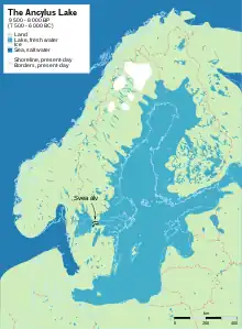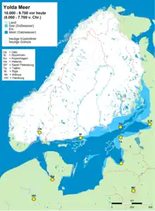 De landområder, som 9.500 f.Kr. var blevet befriet fra isskjoldet, lå i det sydlige Finland direkte under Yoldiahavet og kun de højeste punkter dannede et lille øhav. Fra 8.800 f.Kr. havde ringsæl allerede fundet vej hertil. Yoldiahavet blev afskåret fra havet i vest og udviklede sig til Ancylus-søen.[6][7] Klimaet ændrede sig, hvilket gjorde de korte somre regnfulde og vinterkolde og snedækkede.[8][9]