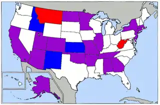 24 stater, Amerikansk Samoa og demokrater bosiddende i udlandet afholdt primærvalg på Super Tuesday, 2008. Blå betegner primærvalg kun for demokrater (3), Rød betegner primærvalg kun for republikanere (2) og Lilla repræsenterer stater, som holder primærvalg for begge partier (19).