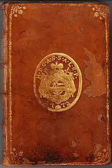 Supralibros på en lærebog med kalveskindsindbinding i form af våbnet for grev Hieronymus af Colloredo, ærkebiskop i Salzburg, dateret 1772