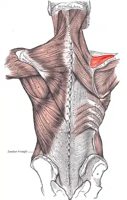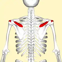 ![]() Posteriort view af musklerne der forbinder den øvre ekstremitet til den vertebrale columna. Supraspinatus er markeret med rødt til højre, mens den er dække af andre muskler til venstre | |