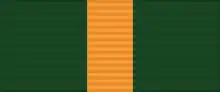 Ved hjælp et øje og en ring er ordensmærket forbundet til en femkantet plade dækket af moiré silkebånd. Ordensbåndet er grønt, 24 mm bredt og i midten er der en 5 mm bred orange stribe.