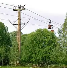 - ligner gondolbanen, men kører på fastspændt wire, hvor vognen trækkes frem og tilbage ved hjælp af endnu et kabel.