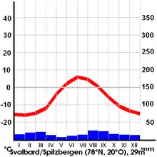 Svalbard har arktisk klima med et stærkt præg af kystklima. Der er midnatssol fra 20. april til 22. august og mørketid fra 27. oktober til 15. februar. På grund af det kolde klima har man valgt Svalbard som det sted, hvor en international frøbank, Svalbard Global Seed Vault, bedst kunne placeres.