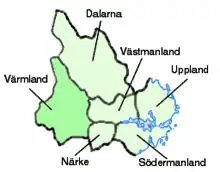 Svealand består af landskaperne Dalarna, Västmanland, Uppland, Värmland, Närke og Södermanland.