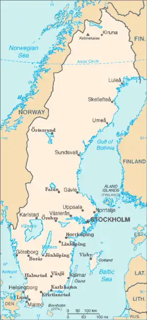 Sverige ligger i Nordeuropa på den østlige del af den skandinaviske halvø. Landet deler landegrænser med Norge i vest, Finland i nordøst, samt Danmark i sydvest via Øresundsbroen. Landet har også maritime grænser til Estland, Letland, Litauen, Polen, Tyskland samt Rusland (Kaliningrad). De omgivende have er den Botniske Bugt og Østersøen i øst og syd, samt i sydvest Skagerrak, Kattegat og Øresund. Sverige udgør en del af det geografiske område Norden.