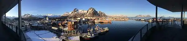 ![]() Udsigt over Svolvær, Lofoten og Vestfjorden, set fra tiende etage i Thon hotel i Svolvær marts 2014. På billedet ses blandt andet Svolvær kirke og Fløyfjellet, Nordland med Svolværgeita. Flere fiskebåde er fortsat ude på lofotfisket. Til venstre skimtes hjell til ophængning af tørfisk. |