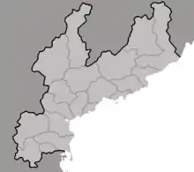 Provinsen er delt ind i tre byer («si»), distrikter (1 «ku» og 1 «chigu») og 15 amter («kun»).[2]