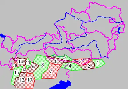 (violet linje viser landegrænser og grænserne mellem Østrigs delstater)