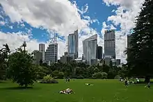 Arealet, som i dag kaldes The Domain, blev reserveret af guvernør Arthur Phillip allerede i 1788 som hans private område.[110] Efter ordre fra guvernør Macquarie blev landet umiddelbart nord for The Domain brugt til at grundlægge Royal Botanic Gardens i 1816. Det gør den til den ældste botaniske have i Australien.[110] Parkerne tjener ikke kun rekreative formål, men bruges også til videnskabelige formål og indeholder plantesamlinger, bibliotek og laboratorier.[111] De to parker har et samlet areal på 64 ha med 8.900 forskellige plantearter og har et årligt besøgstal på 3,5 millioner.[112] Syd for The Domain ligger Hyde Park. Det er det ældste offentlig parkområde i Australien og måler 16,2 ha.[113] Det blev brugt til såvel afslapning som græsningsareal i koloniens første tid.[114] Macquarie dedikerede parken i 1810 til "rekreation og fornøjelse for byens indbyggere" og navngav den efter den originale Hyde Park i London.