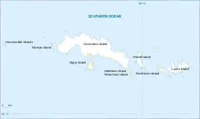 Den første ekspedition til øgruppen blev udført af William Speirs Bruce i 1903. Ekspeditionen overvintrede på Laurie Island. Bruce omgjorde nogle af Weddells navneændringer og etablerede en meteorologisk station. Den meteorologiske station blev overdraget til argentinske meteorologer, da Bruce og hans mænd drog fra øgruppen i 1904. Den meteorologiske station er fortsat i drift (2007) og er dermed den ældste forskningsstation i kontinuerlig drift i Antarktis.