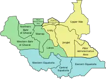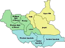 Sydsudan er opdelt i ti stater, der svarer til tre historiske regioner: Bahr el Ghazal, Equatoria og Greater Upper Nile