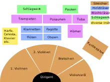 En evt. solist placeres foran orkestret, skråt bagved dirigenten. Hvis der medvirker kor, placeres det bag orkestret (hævet på podier så der er udsyn til dirigenten).