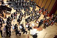 Koncertmesteren, som er en førsteviolin, sidder lige til venstre for dirigenten. Når en koncert starter er det kutyme at dirigenten giver koncertmesteren hånd.