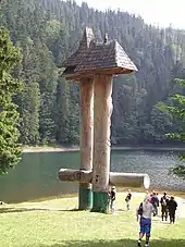 Arkitekten Yurii Solomin (Юрій Соломін) udsmykkede området omkring søen med bidrag fra billedhuggerne Ivan Brodin (Іван Бродин) og Mykhailo Sanych (Михайло Санич), som skabte den røde træskulptur "(Syn i Vir)" . Kompositionen er 13 meter høj og hviler på en stålbund.