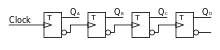 - Nulstilling: Hver flip-flop i rækken kan forsynes med en "tvungen-reset-indgang", som bringer flip-floppen i "0"-tilstand. Alle disse reset-indgange forbindes til en fælles linje, som nu kan bruges til at nulstille tælleren på vilkårlige tidspunkter.