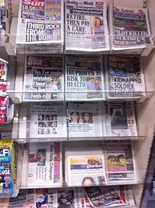 Udstillingsstativ af britiske aviser, hvoraf mange er tabloider.