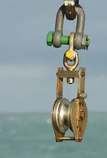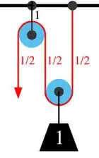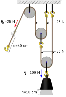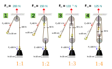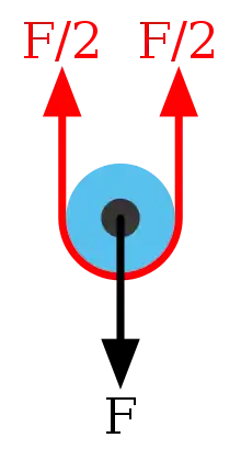 Som det fremgår af fig.B er det ikke ligegyldigt om man trækker i samme retning som den vej loddet bevæges i. Den samme kraftudveksling, 1:2, er her opnået ved hjælp af to trisser.