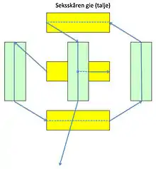 En taljeblok med 3 eller flere skiver kaldes gie, men den største talje, der generelt bliver brugt, er en seksskåret. For at få trækket ind i midten af taljen så den ikke trækker skævt og for at tovene ikke skal krydse hinanden, er der en anden skæringsmetode som bruges for 6 eller flerskårne taljer, som vist på illustrationen.