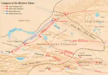 Kejser Taizong brugte i sin krig mod de vestlige og østlige tyrkere den kinesiske strategi om at "bruge barbarer til at kontrollere barbarer." I 641 indledte han en borgerkrig mellem de vestlige tyrkeres østlige og vestlige konføderationer ved at støtte Isbara Yabghu Kaghan. Kaghanen i øst, Tu-lu Kaghan, invaderede de oasestater, der kontrolleredes af Isbara Yabghu i vest. Han myrdede sin rival og forenede det vestlige tyrkiske khaganat.[4]