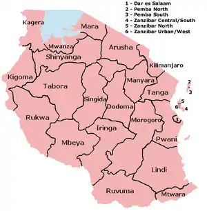 Tanzania er administrativt inddelt i 26 regioner (swahili: mkoa), hvoraf de 21 er på fastlandet, tre på Zanzibar og to på Pemba. På næste niveau er landet inddelt i 127 distrikter (wilaya), hvoraf nogle har særskilt status som bydistrikt, som Dar es-Salaam og Mwanza, eller kommunale distrikter, som Arusha, Dodoma, Iringa, Kilimanjaro, Mbeya, Morogoro, Shinyanga, Tabora og Tanga.