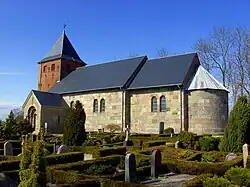 Skib og kor med apsis fra romansk tid Tårn fra senere middelalder |