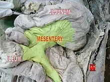Tarmkrøs fremhævet med grøn farve og betegnet med det engelske ord for tarmkrøs, Mesentery