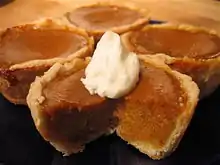 Til højre på billedet ses en tartelet med fyld og cremefraiche i en linsedej som en dessert. I Danmark laves tarteletter af butterdej som "skål" for fyldet.