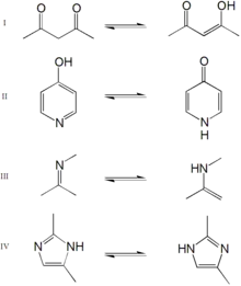 Sædvanligvis forekommer dette som migrering af hydrogenatomer (protoner) med en ombytning af en enkeltbinding med en dobbeltbinding. I opløsninger hvor tautomeri er mulig, vil en kemisk ligevægt mellem de to tautomerene opnås. Forholdet mellem tautomerene kommer an på mange faktorer, inklusiv temperatur, opløsningsmiddel og pH. Tautomeri kan katalyseres med syrer og baser.[1]