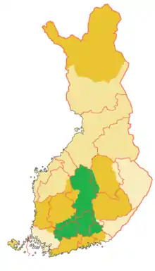 Det historiske landskab Tavastland i grøn (nuværende landskabsgrænser i rosa).