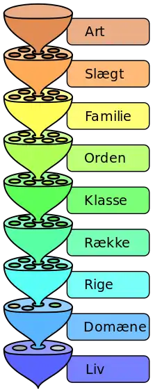 Den bedst kendte og videst brugte videnskabelige taksonomi er den Linnæiske taksonomi af levende væsener. Denne taksonomi er baseret på et system udarbejdet af den svenske videnskabsmand Carl von Linné i hans klassiske bog Systema Naturae. Som eksempel har Linné et overbegreb som 'organisme' der har følgende underbegreber og under-underbegreber (osv.), som bør specificeres for en komplet bestemmelse af arten i systemet: Rige, række, klasse, orden, slægt og art.