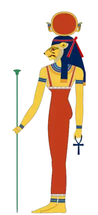 ![]() The goddess Tefnut portrayed as a woman, with the head of a lioness and a sun disc resting on her head. | |||||
