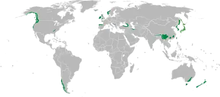 Vestvendte kystegne, alle nær Atlanterhavet i Irland, Bretagne, det sydlige Norge[1] og nordlige Spanien. Skovene i disse egne består hovedsageligt af forskellige sorter af eg, typisk vintereg (Quercus petraea) og er blevet udnyttet og påvirket af mennesker i århundreder. Visse skovområder i England betegnes indimellem også som tempererede regnskove.