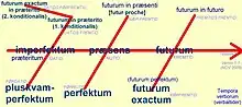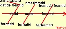 Tidsakserne til højre viser forholdene mellem nogle af tiderne, først med danske betegnelser og dernæst med grammatisk fagterminologi (latin).
