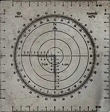 En TS svarer med adskillige decimalers nøjagtighed til en milliradian, og til en hel cirkel på radianer svarer der således (i heltal) 6283 TS. Men for at det skal være nemmere at regne med store vinkelmål, så defineres en fuld cirkel til at være 6400 TS. Bagsiden af kompashuset på Forsvarets kompas M/71 er således inddelt i 64 cirkelbuer, hver defineret til at være 100 TS.