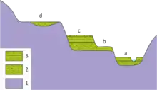 a) nuværende flodslette; b) den første flodslette/terrasse; c) anden flodslette/terrasse; d) tredje flodslette/terrasse med aflejring