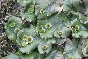 Thallus hos Almindelig Levermos, her med de små "formeringsbægre", der rummer klonet afkom af moderplanten.