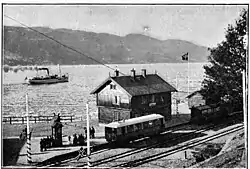Stationsbygningen blev opført til åbningen i 1908 efter tegninger af Finn Knudsen.